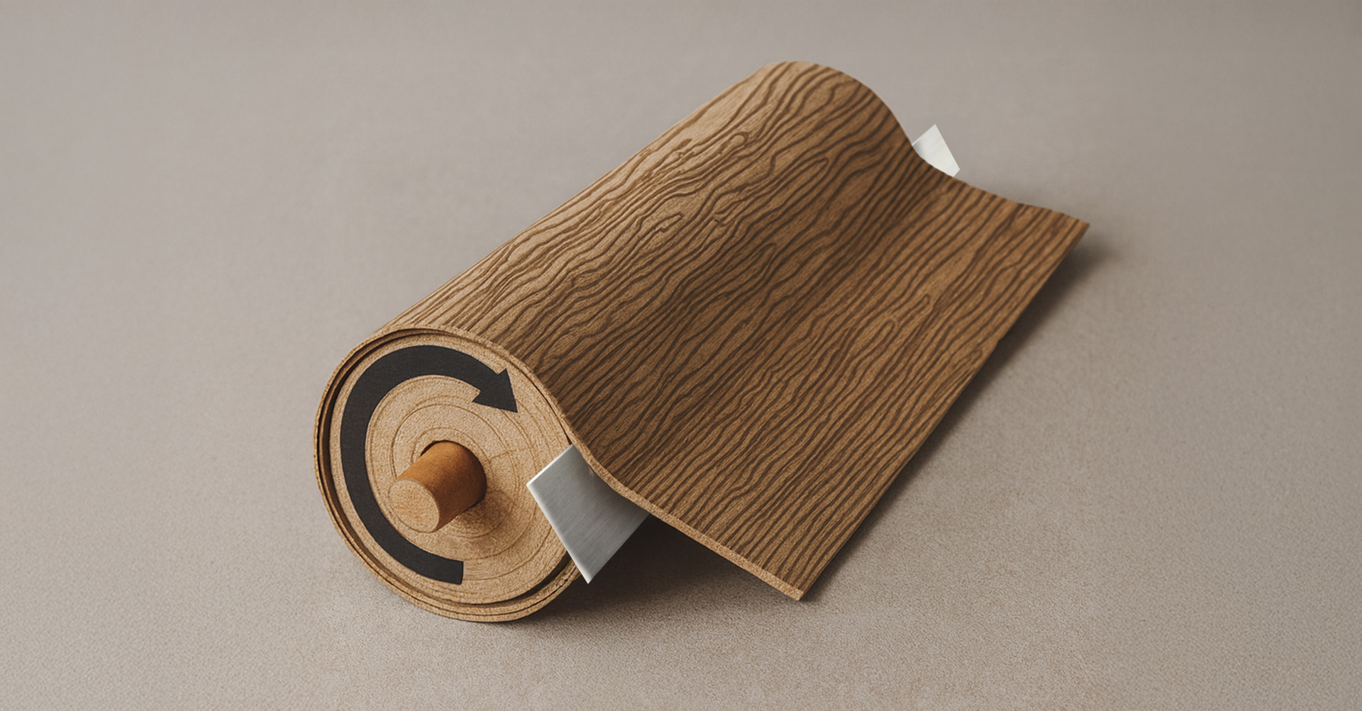 Our patented slicing process answers that question with remarkable efficiency. This high-yield technique yields approximately 300% more usable wood veneer than traditional methods. The impact is substantial: fewer trees harvested, significantly less waste and far more product from the same volume of wood.